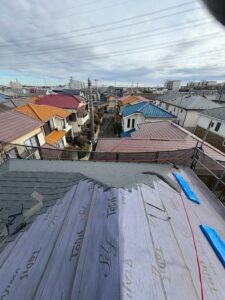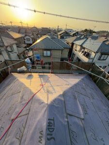 既存屋根の上からルーフィングシート(防水シート)を敷き込んでいきます。