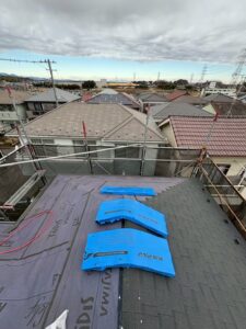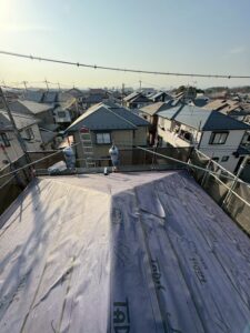 既存屋根の上からルーフィングシート(防水シート)を敷き込んでいきます。